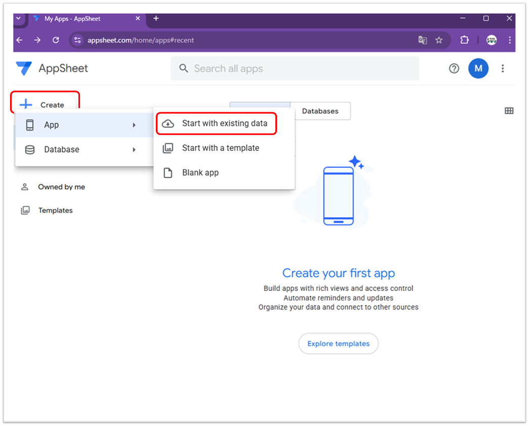 メニューが表示されるので、「App」 → 「Start with existing data」 の順に選択します。