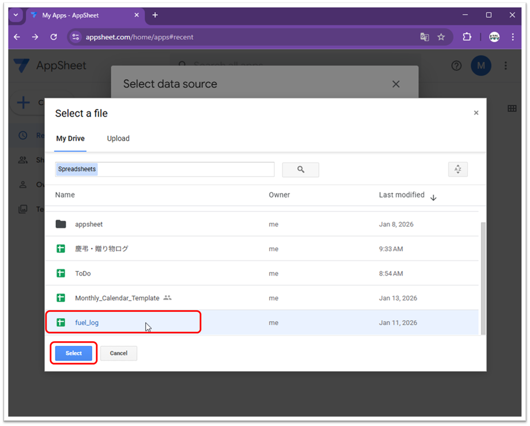 あらかじめ作成しておいたスプレッドシート(例:「fuel_log」など)を選んで、左下の 「Select」 ボタンを押します。