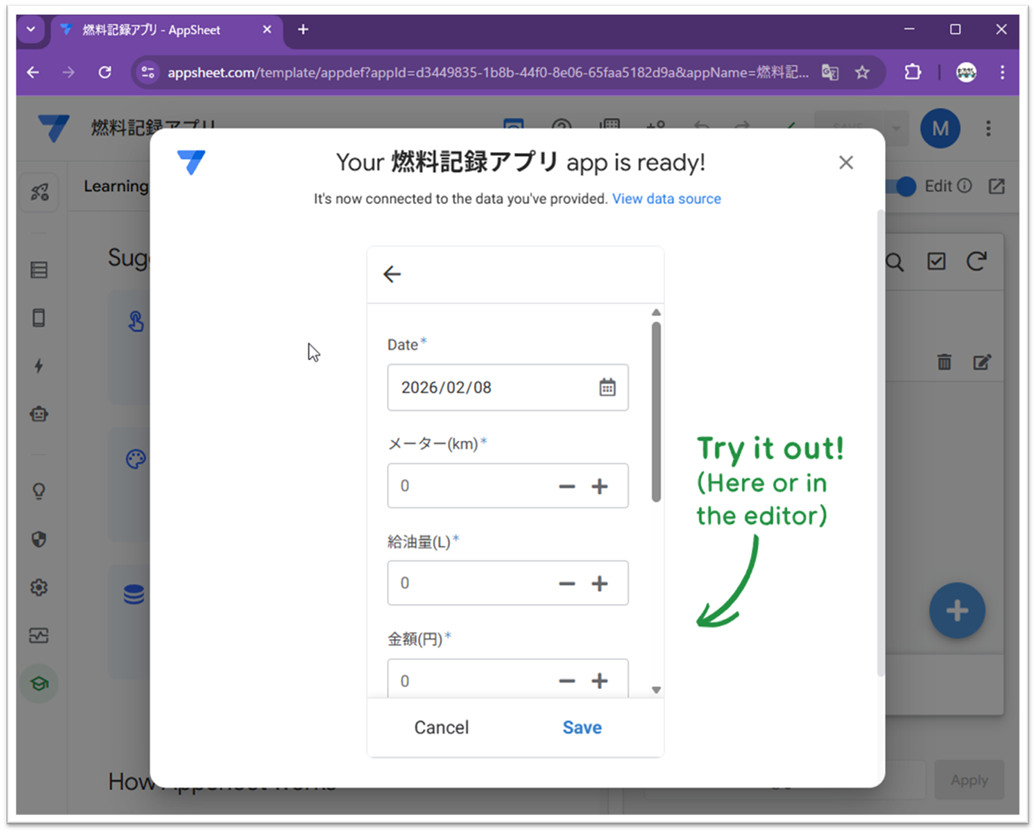 スプレッドシートの項目(日付、メーター、給油量など)をAppSheetが読み取り、自動で入力画面を組み立ててくれます。