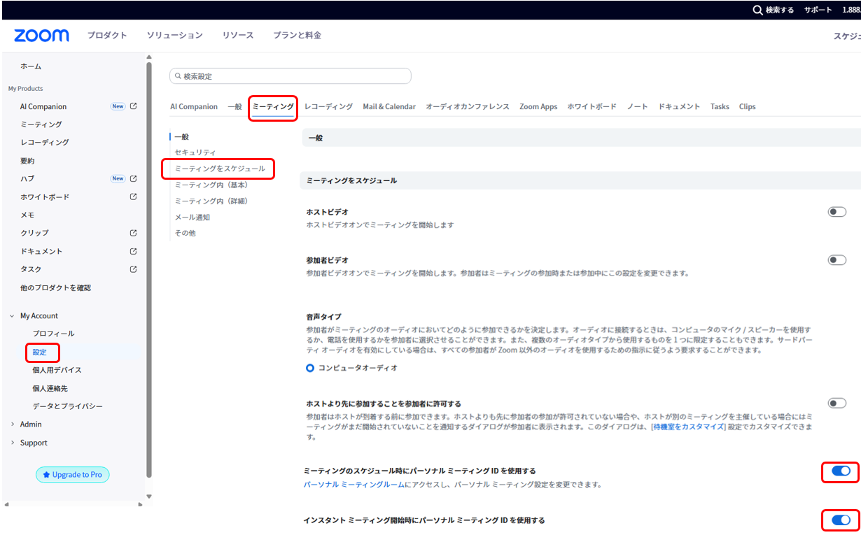 My Account の 設定 を開き、上部の ミーティング タブをクリック、その中の ミーティングをスケジュール セクションにある以下の2つの項目を ON(青色) にします。