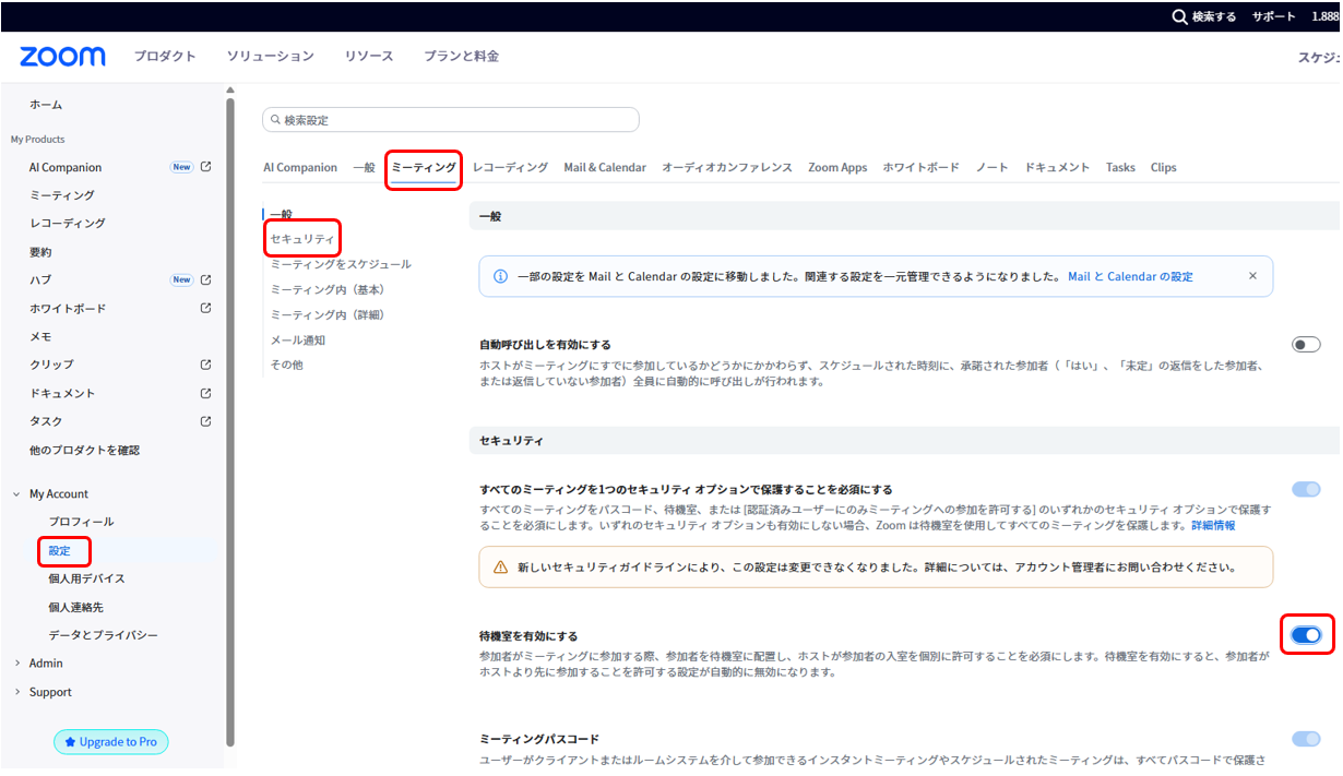 [!TIP] 「待機室」を必ず有効にする 知らない人がアクセスしてきても、ホストが許可しない限り入室できないので安心です。 [設定] > [ミーティング] > [セキュリティ] セクションにある「待機室を有効にする」をON(青色)にしておきましょう。>